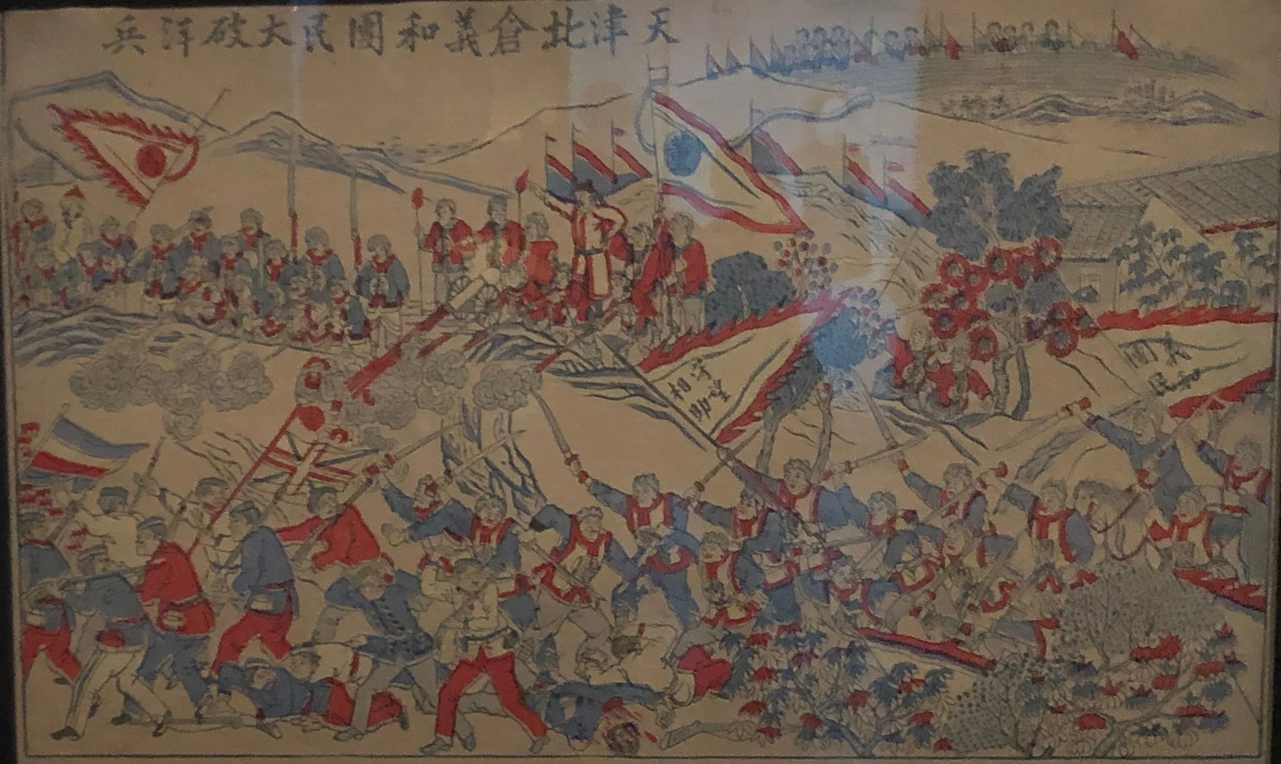 【天津北仓义和团和国民打破洋兵】。宣传画是中国民众喜欢和多见的作品类。据说宣传画始于1800年代。此画作于1900年,地点:天津。