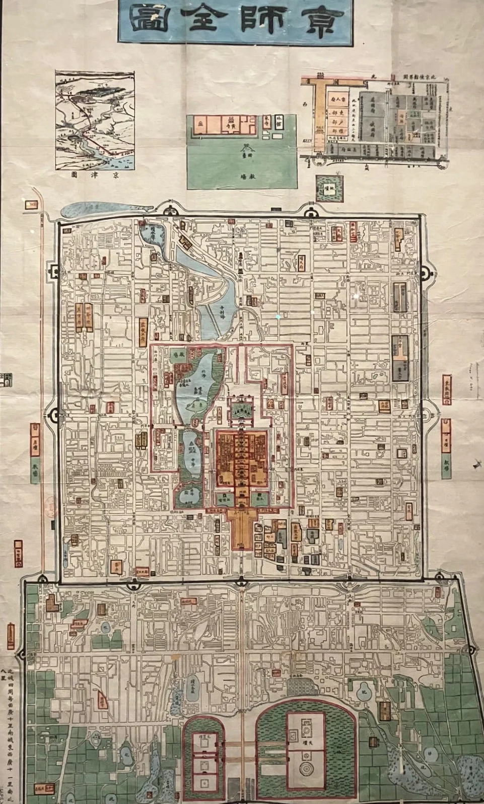 北京全图 (约1900年)。当时的北京居住是满汉分开隔离的。满人住在四方型的北部城区,汉人住在南部,有墙隔离。