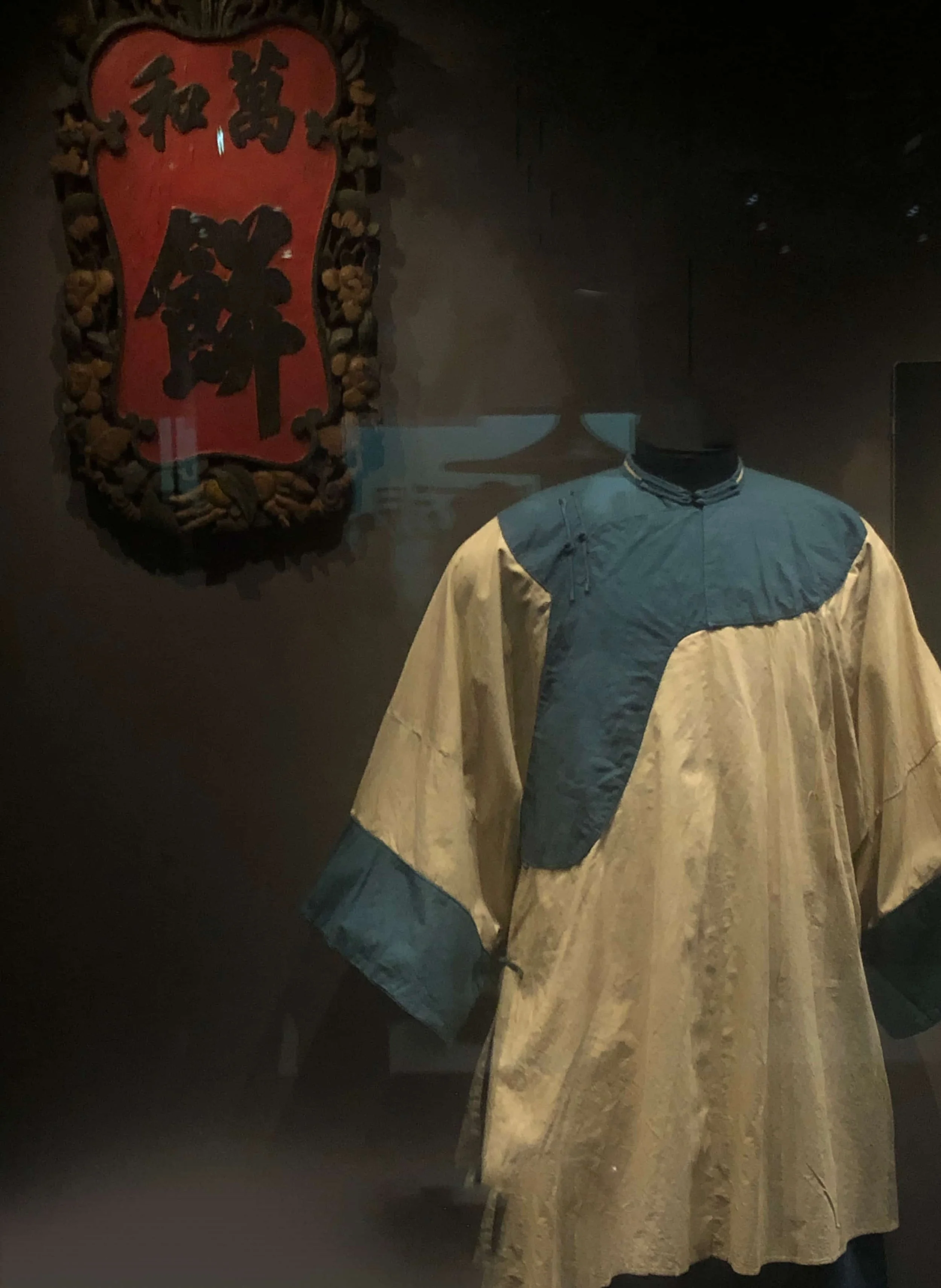 饼铺的招牌(万和饼 ),1860 -1912 年,木质品。厨师的工作服,棉织品(1890 - 1905 年)。