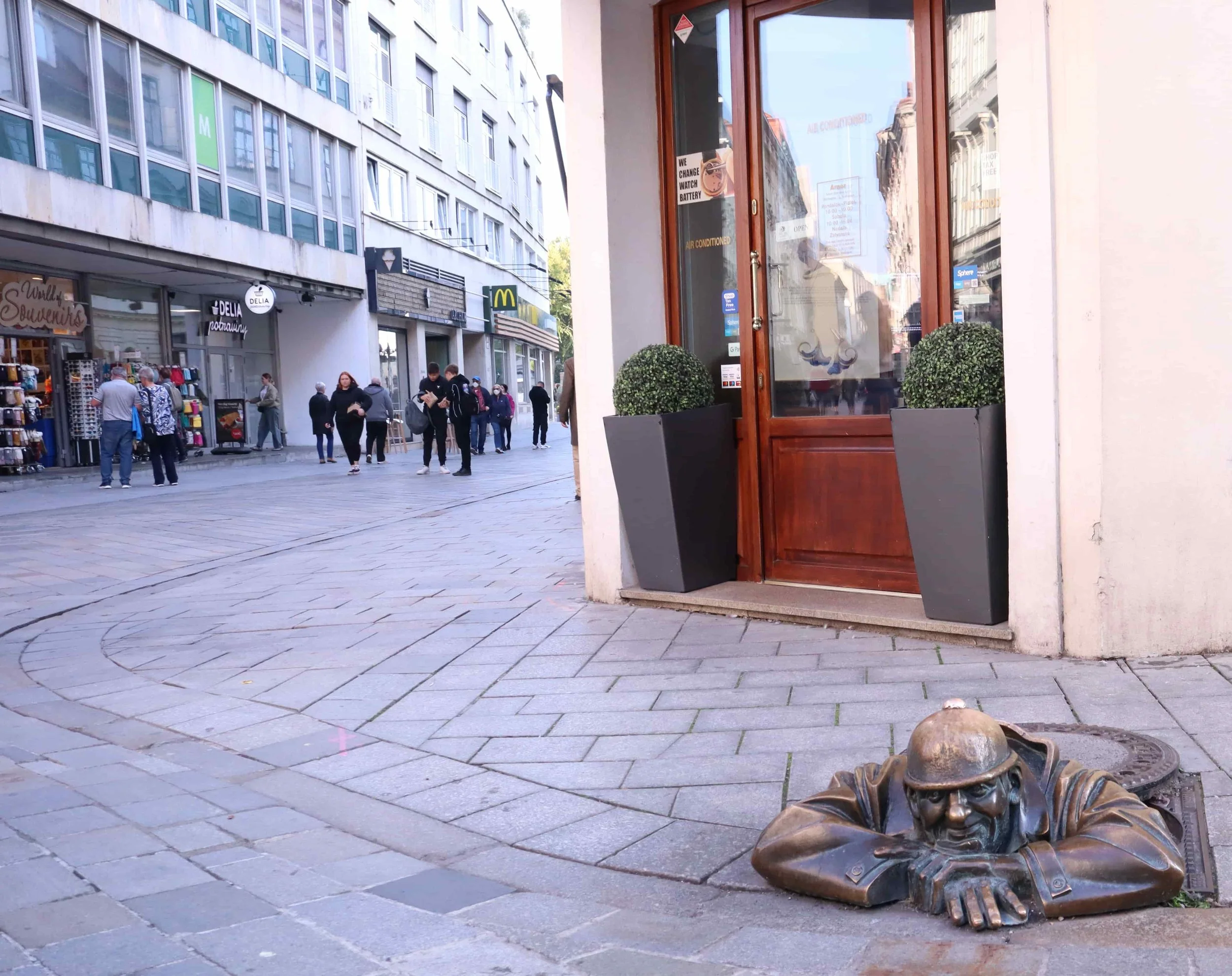 在布拉提斯拉瓦的城里,有一处景点要去看看。是一个雕塑:一个清理工从下水道口出来。很有喜剧感。据说摸摸他的头,会有好的运气。