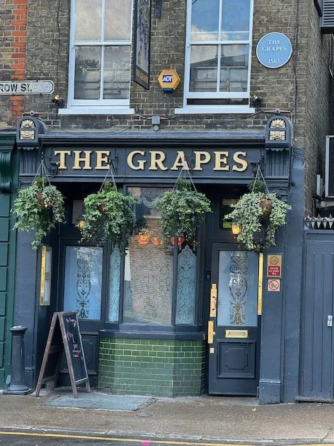 “葡萄酒吧” (The Grapes), 是路旁的联排老房子中,最边上的一栋。如果不仔细,你从它的门前走过,也不会认出它。它的门前是一段较安静的路, 叫Narrow Street。从酒吧到伦敦的第二金融区,金丝雀码头 (Canary Wharf),仅要走5分钟。