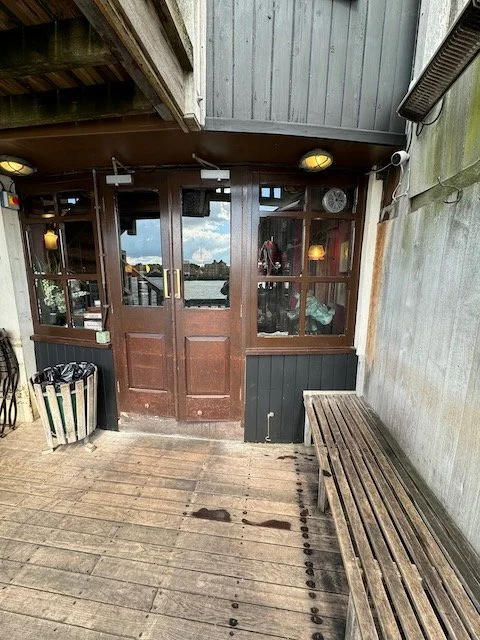 从酒吧间的后门出去,是一个带护栏的开放平台。平台的下面就是泰晤士河。